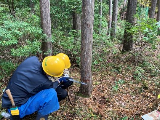 東京三栄会「森林フェスタ」を千葉県にある亀山(かめやま)山林にて開催しました。今回は24名の参加者の皆さんと間伐体験、丸太切り体験、ヒノキの葉で作るエアーフレッシュナー作り等を行いました。その中でも特に間伐体験では、一本の木を倒すために皆で協力し合い、木がやっと倒れた際に達成できたことを喜ぶ声もあがりました。