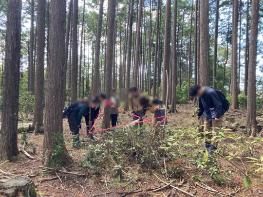 その後は、森林管理業務の説明を行いながら山林内を巡視し、森に生息する動植物についても解説しました。皆さんが熱心に話に聞き入っている姿がとても印象的でした。
