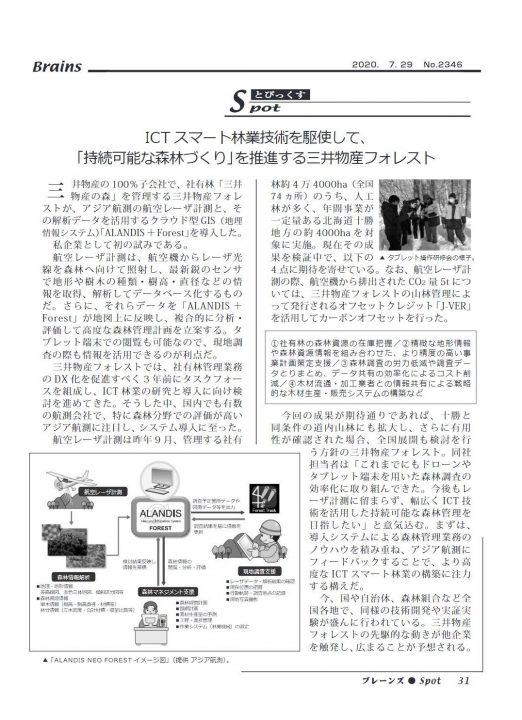当社は、アジア航測株式会社が提供する森林のレーザー計測並びにその解析データを活用するクラウド型GIS「ALANDIS+ Forest」を導入しました。総合商社の専門情報誌「ブレーンズ」7月29日号へ記事が掲載されました。